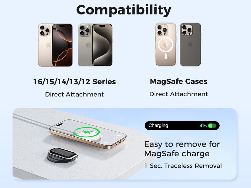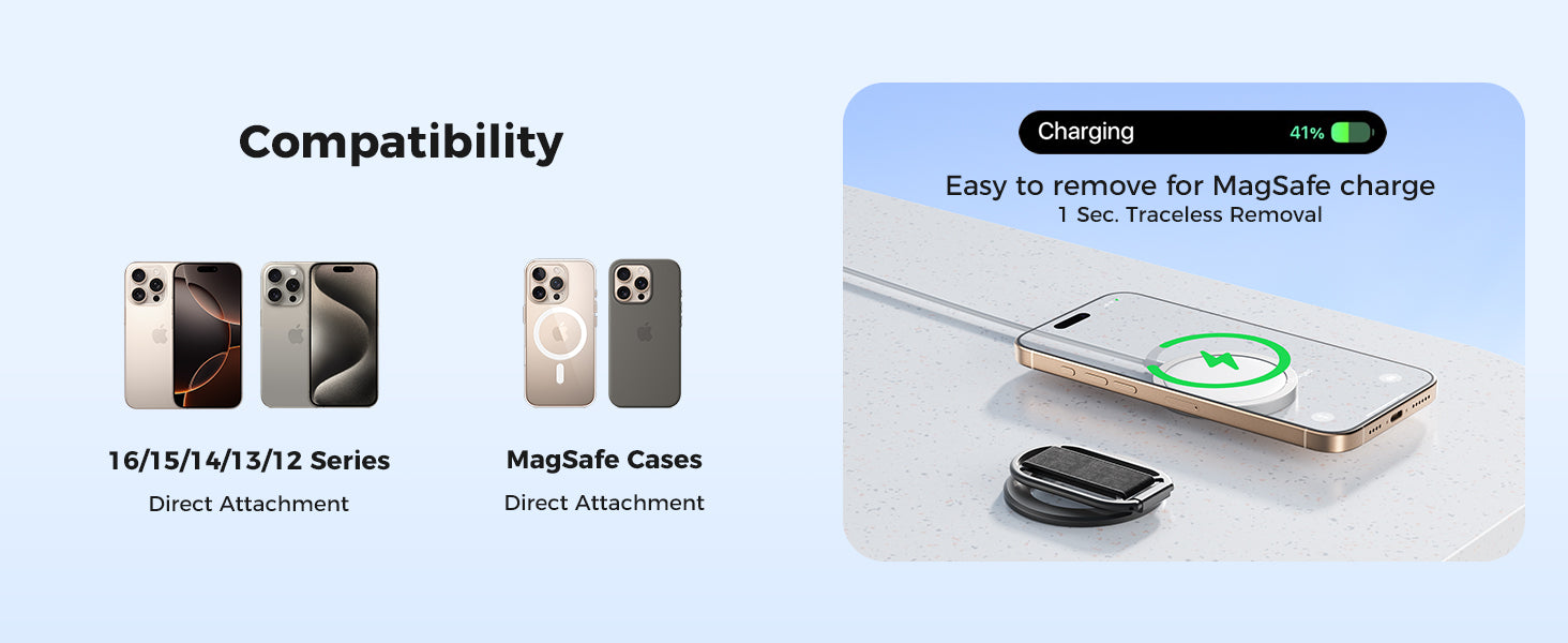 Ultra-strong 5.5 lb MagSafe grip with 360° adjustable stand and soft Velcro strap, removable for wireless charging and designed for iPhone 12–17 MagSafe models.
