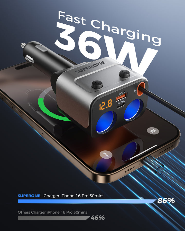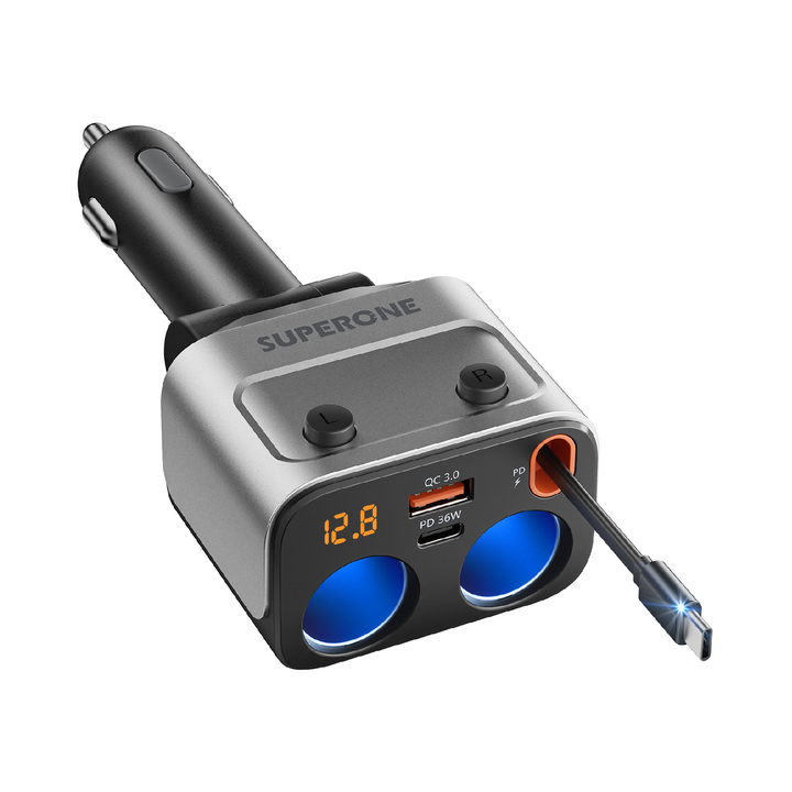 180W car charger splitter with a retractable cable. Expand to 2 sockets & charge 4 devices. Features a voltage display for safe, powerful, and tidy charging.