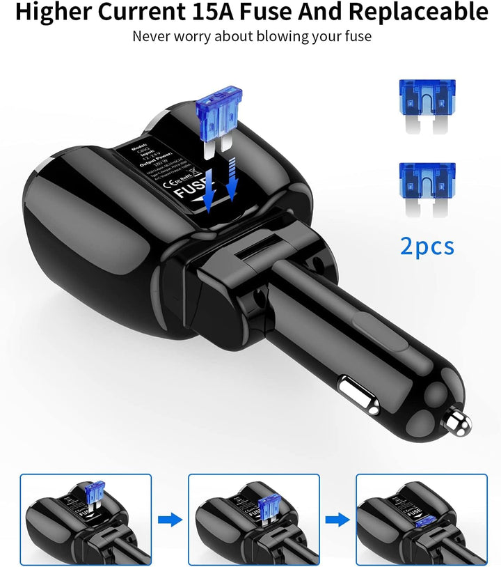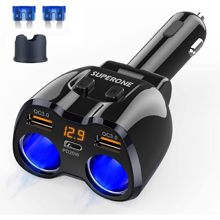 180W car power splitter with 20W PD & 3 USB ports. Features LED voltage display & independent switches. Charges multiple devices simultaneously. 12V/24V compatible.