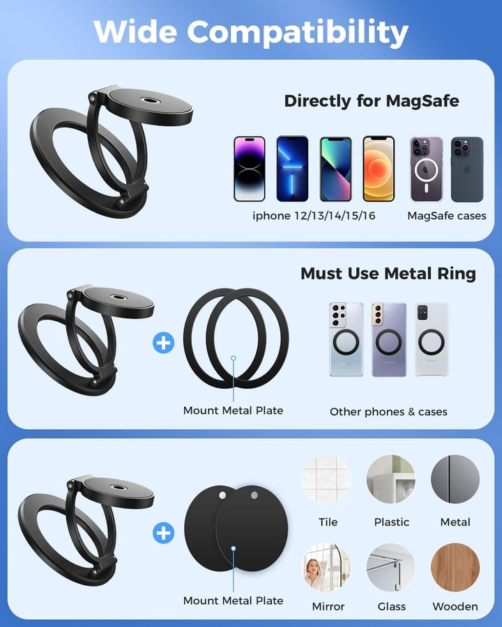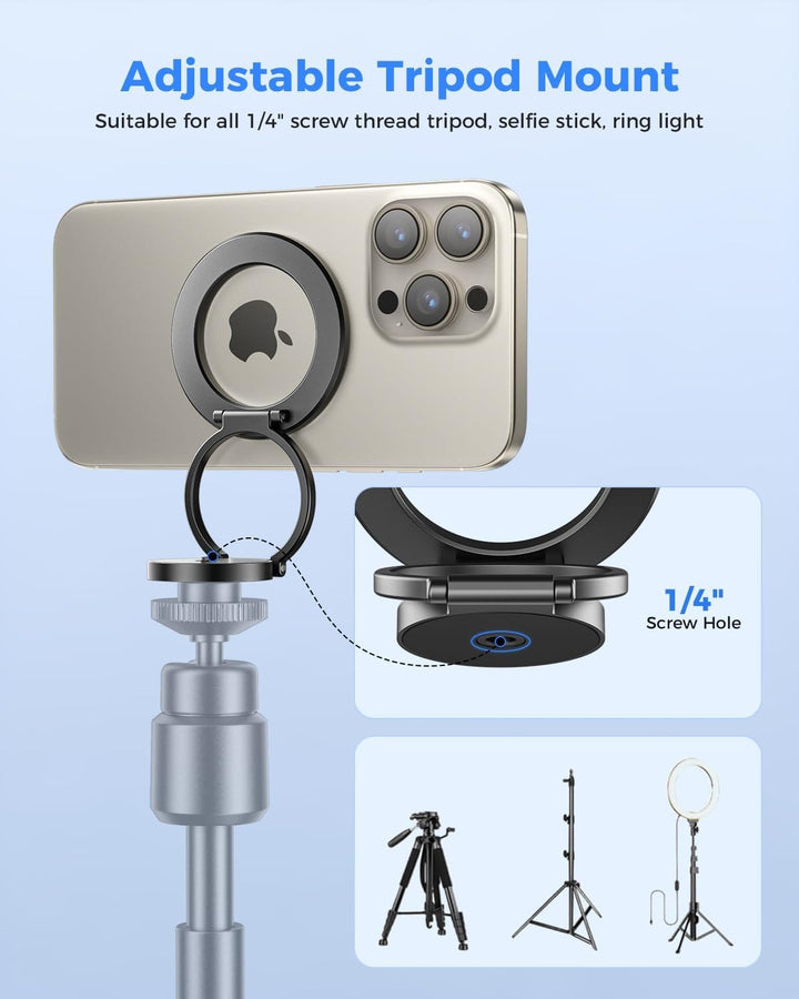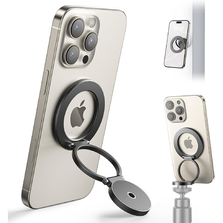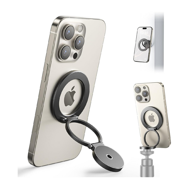 Unlock triple functionality. The SUPERONE MagSafe grip is a ring holder, a 1/4"-20 tripod adapter, and a magnetic mount for iron surfaces. Perfect for stable shooting, vlogging, and hands-free use. Compatible with iPhone 12-15 series and MagSafe cases.