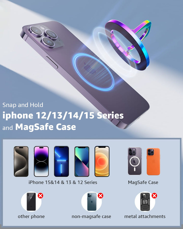 NOTE: This Mag Safe phone grip is only designed for iPhone 16/15/14/13/12 Series with Cases or No Case. it will not stick other iPhone models or Non-Mag Safe Cases.