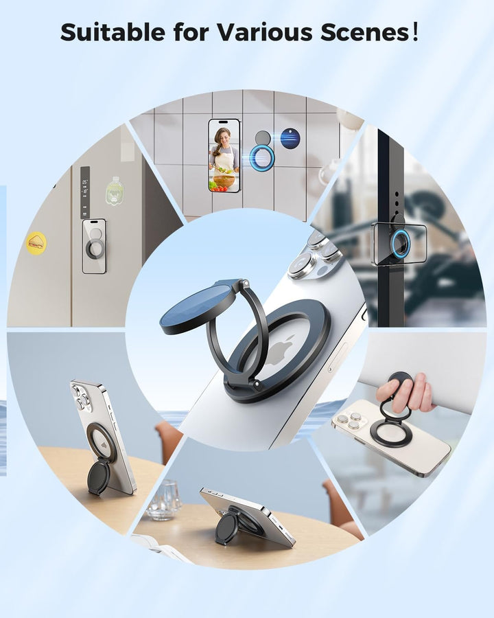 The MagSafe phone ring holder has strong magnets on the front and back, magnetic phone grip can fix the phone on metal surface such as refrigerator fitness equipment etc. Plus,we provide extra 2 metal stickers that can be stuck to non-metal surfaces like mirror and wall.